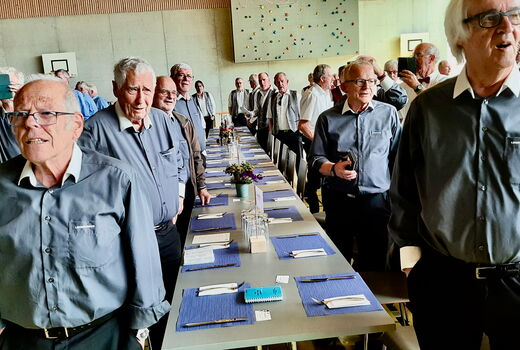 Am 24. Mai 2025 wollte es der Männerchor wieder einmal wissen, wo er steht. So trat der Chor am Kantonalen Gesangsfest in Sins im Freiamt auf. Sein Auftritt wusste sehr zu gefallen und wurde mit viel Applaus bedacht! Dies tat den Sängern gut, denn mit dem Passerau (von um 1540), neu gesetzt von Tobias von Arb, hatte sich der Chor ein hehres Ziel gesetzt. Der 4-stimmige fugenhafte Satz mit seinem schnellen Tempo kratzte an der oberen Grenze unserer Möglichkeiten. Und, die Jury sagte: Il était bon! Mit dem Lied «das Morgenrot», von R. Pracht nach einem Gedicht von K. Hoffmann eröffneten die Sänger den Auftrittsreigen. Die Dynamik des Liedes klang beinahe wie ein mystisches Gebet in der schönen Barock-kirche von Sins. Der Chor zeigte nochmals sein vielseitiges Können mit den Visionen eines weinseligen Zechers von Wilhelm Heinrichs – «Blauer Mond»; die anspruchsvolle Parodie gelang bestens. Glücklich und zufrieden verbrachten wir noch einige frohe Stunden im geselligen Kreise der grossen Sängerschar im Freiamt.